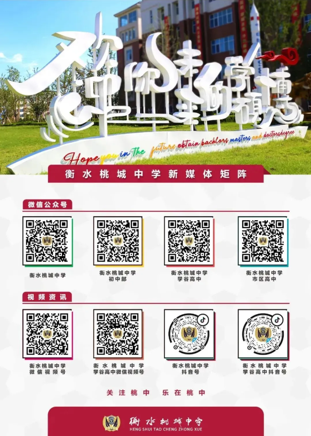 衡水桃城中學始終把關心和愛護學生成長放在首要位置,助力學生放飛青春夢想、實現(xiàn)人生價值,為他們的成長進步點贊、喝彩。長期以來,桃中品牌得到了社會各界的廣泛贊譽,衡水桃城中學愿與社會各界,共謀教育事業(yè)發(fā)展大計,回饋社會的支持厚愛。